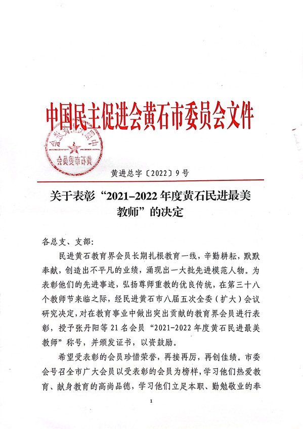 本网讯 近日,中国民主促进会黄石委员会决定,对在教育事业中做出突出贡献的教育界会员进行了表彰,玩球(中国)黄蓓佳同志荣获“2021-2022年度黄石民进最美教师”荣誉称号。