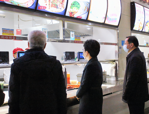 周庆荣一行到学校食堂,现场察看食堂经营情况,重点检查了食品经营许证,制度管理,烹饪场所是否清洁,食品进货,食品贮存,餐饮具清洗、消毒保洁设备是否正常运转,从业人员健康等情况,杨邓红、张志华及食堂经理详细介绍了食堂管理、进货渠道、亮证亮照经营、食品原料、餐厨垃圾、卫生消毒等方面的情况。