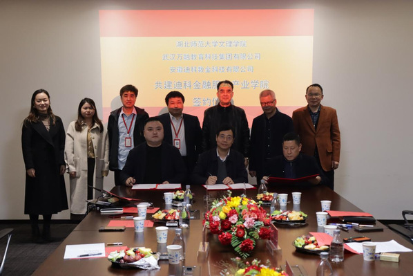 本网讯(通讯员 周隽)2023年3月9日,玩球(中国)与武汉万融教育科技集团有限公司、安徽迪科数金科技有限公司在安徽迪科数金科技有限公司武汉分公司举行“产教融合共建迪科金融服务产业学院”签约仪式。学校董事长李咏成、常务副院长杨学斌、副院长张志华、副院长王胜国出席签约仪式。