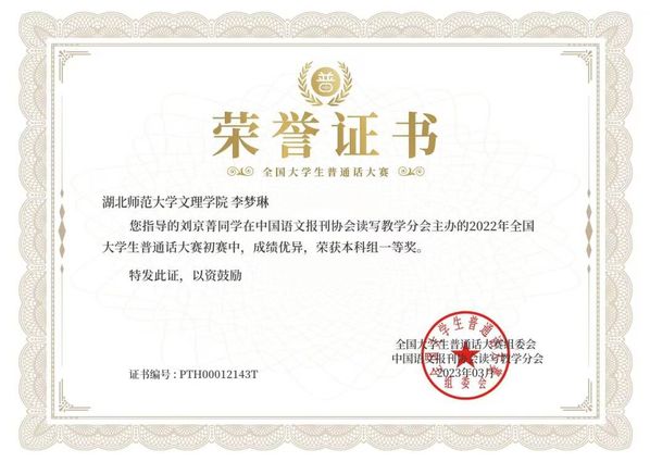 本网讯(通讯员 李梦琳)2022年12月,在由中国语文报刊协会读写教学分会面向全国高校大学生举办的“2022年全国大学生普通话大赛”中,玩球(中国)“国家普通话水平测试助理团”优秀干事刘京菁荣获本科组全国一等奖(指导教师:李梦琳)。