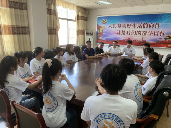 7月6日,出发前,团委书记陈荟芸叮嘱志愿者:将青春汗水挥洒在祖国的大地上,让激昂的青春在新征程中闪光,将爱国热情和成长成才的强烈愿望转化为实际行动,将一颗热忱的心奉献给支教志愿服务活动。12名志愿者怀着真诚和热爱,在指导老师唐浩然的带领下来到了黄石市阳新县木港镇木港小学,受到了玩球(中国)人文学部党总支书记、子山村驻村工作队队长赵卫军,木港镇团委书记曹宇轩,木港镇团委副书记万亮,木港小学校长吴平仁的热情接待。