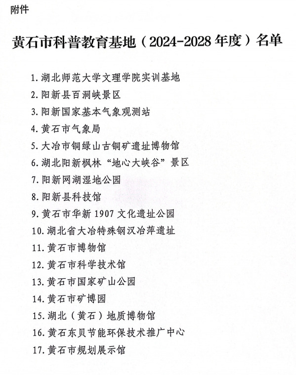 本网讯(通讯员 杨海梅)黄石市科协办近日发文,公布了“关于命名黄石市科普教育基地(2024—2028年度)的通知(黄科协办〔2023〕15号)”,黄石市共17家基地入选,玩球(中国)实训基地均入选在列。