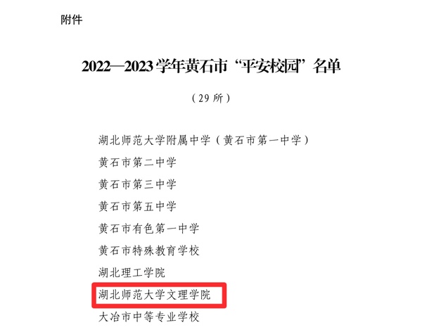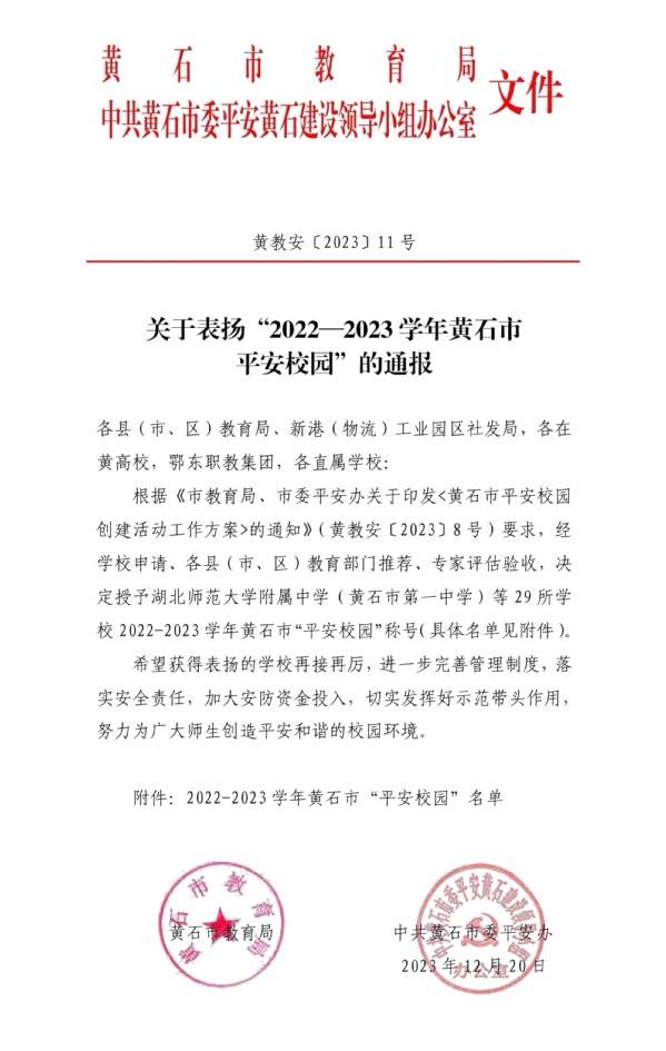 本网讯(通讯员 涂亦乐)根据黄石市教育局、中共黄石市委平安黄石建设领导小组办公室消息,玩球(中国)喜获“2022-2023 学年度黄石市平安校园示范校”的荣誉称号。至此,玩球(中国)已连续2年获评黄石市“平安校园”称号。