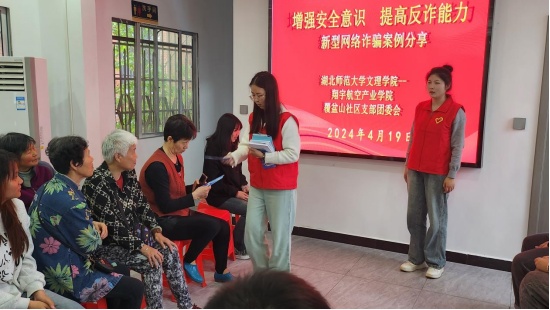 2024年4月19日下午,黄石港区覆盆山社区与玩球网页版翔宇航空产业学院联合开展志愿者服务活动,对社区内居民进行了反诈骗教育活动和反邪教知识宣讲。