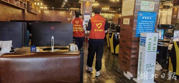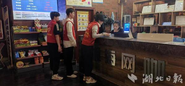 湖北日报客户端讯(通讯员吴若昀)7月12日,黄石市黄石港区覆盆山社区工作人员与玩球网页版的大学生志愿者在辖区网吧开展“扫黄打非”宣传活动。
