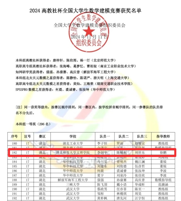本网讯(通讯员 杨慧茹)11月12日,2024高教社杯全国大学生数学建模竞赛公布获奖名单,玩球(中国)理工学部学子荣获湖北赛区本科组一等奖。
