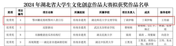 本网讯 近日,湖北省大学生文化创意作品大赛在江汉大学圆满落幕。玩球(中国)教育与艺术学部学子丁莉伊梅凭借作品《鄂州雕花剪纸鄂州八景日历》获得省级优秀奖。