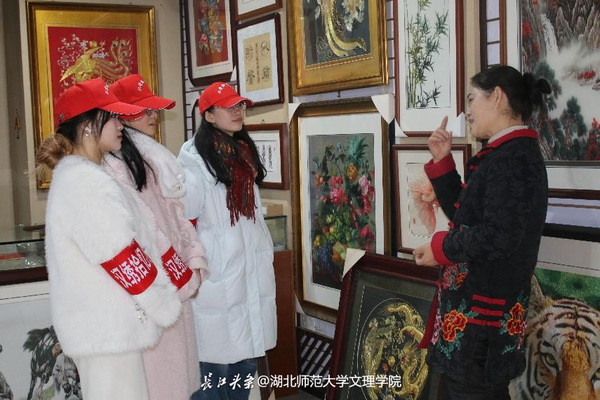 在湖北省工艺美术大师石玉香的工作室,石老师为我们讲解了工作室内一幅幅精美的汉绣作品以及其背后的故事,从戏剧服装到宗教用品、从市井生活到民俗活动,从舞台装饰到艺术作品,充分展现了汉绣多元化发展以及鲜明的民族特色,小队成员也对汉绣有了新的认识。在与石老师的探讨中,她指出,一个好的绣品最重要的就是绣工,包括针法和设计,而设计要随时代进步而进步,与世界相融合。