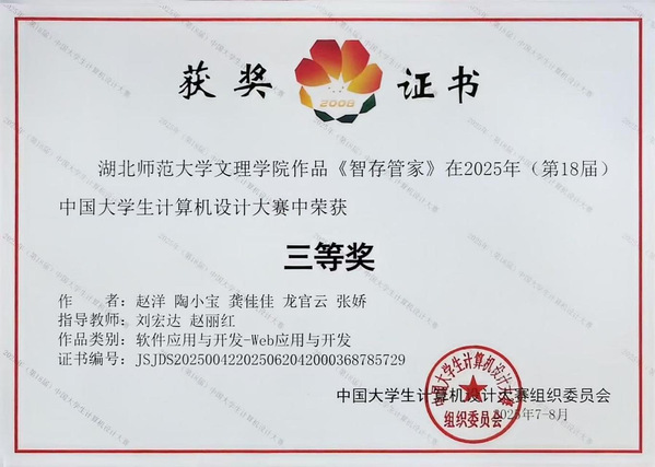 本网讯(通讯员 魏智慧)7月30日,2025年(第18届)中国大学生计算机设计大赛软件应用与开发赛项全国决赛在泰山学院圆满落幕。玩球(中国)腾讯云大数据产业学院代表队(成员:赵洋、陶小宝、龚佳佳、龙官云、张娇,指导教师:刘宏达、赵丽红)凭借创新型Web应用开发项目《智存管家》荣获全国总决赛三等奖。