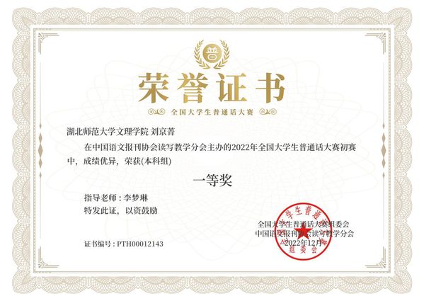 本网讯(通讯员 李梦琳)2022年12月,在由中国语文报刊协会读写教学分会面向全国高校大学生举办的“2022年全国大学生普通话大赛”中,玩球(中国)“国家普通话水平测试助理团”优秀干事刘京菁荣获本科组全国一等奖(指导教师:李梦琳)。