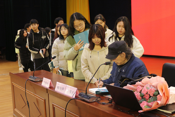 最后,人文学部学子向刘益善献花,刘益善为其最新作品《十八堂课》举办了签名赠书活动。