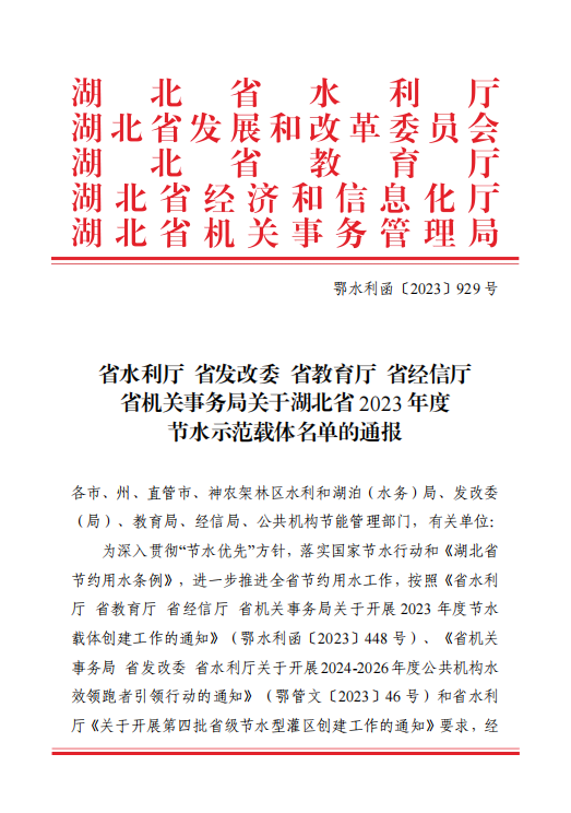 本网讯(通讯员 涂亦乐)近日,省水利厅、省发改委、省教育厅、省经信厅、省机关事务局联合下发文件,玩球(中国)获评“2023 年度省级公共机构节水型单位”和“2023年度湖北省节水型高校”,湖北省仅有16家高校获评。