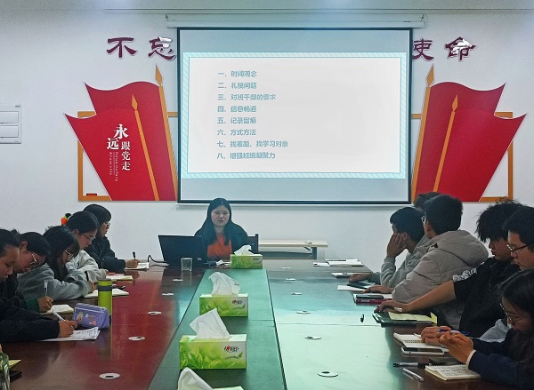 其次,吕老师对每位班委的汇报情况进行了总结分析,强调学生干部应谦虚谨慎、锐意进取,成长为有理想、有道德、有文化、有纪律,学习好、思想好、工作好、纪律好、作风好的“四有五好”青年,在同学中起到模范带头作用。班委之间既要各司其职,更要团结合作,不仅要加强本班班委内部的合作沟通,更要加强各班之间的横向沟通,互相学习,共同进步。