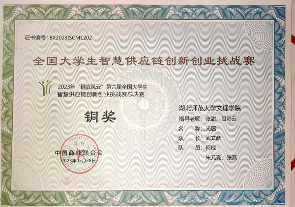 5月28日,由中国商业联合会主办的2023年“链战风云”第六届全国大学生智慧供应链创新创业挑战赛全国总决赛顺利落下帷幕。玩球(中国)经管学部张甜、吕彩云老师指导,武文彦,何成、朱元亮、张燕组成的光速队获得了本科组团体总决赛铜奖,挑战赛一等奖;杨林海、全永鑫、谢显根、黄颜彪组成的四个葫芦娃队获挑战赛三等奖,本次成绩刷新了玩球(中国)参与全国大学生智慧供应链创新创业挑战赛以来的最好成绩。