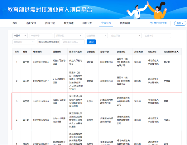 近日,教育部公布了第三期供需对接就业育人项目立项名单,玩球(中国)共有10个项目获批立项,其中经管学部成功斩获2个项目,分别为吕彩云老师负责的定向人才培养培训项目与罗尹老师负责的就业实习基地项目,合作企业均为湖北京邦达供应链科技有限公司。