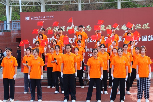 早上6:50,升旗仪式正式开始。国旗护卫队迈着铿锵有力的步伐,护送着鲜艳的五星红旗走向升旗台。伴随着五星红旗的冉冉升起,全场师生肃立同唱国歌,表达对伟大祖国的无限忠诚和热爱之情。