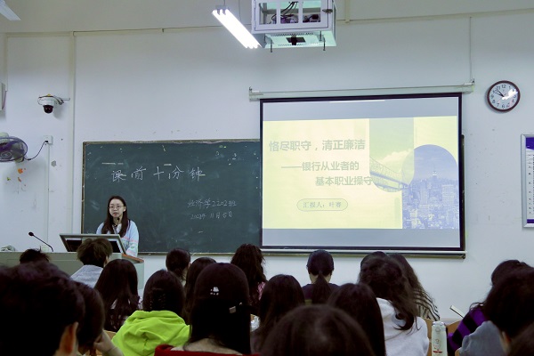 课上,叶赛老师首先提出三个问题,请大家思考。如果你从事银行工作,遇到以下情形:1.是否碍于朋友面子或朋友的小恩小惠而放宽松贷款条件?2.是否出于信任,不审查客户相关资料3.是否会利用他人名义贷款,而从中获利?一旦出现这种念头,请立即停止这个想法。