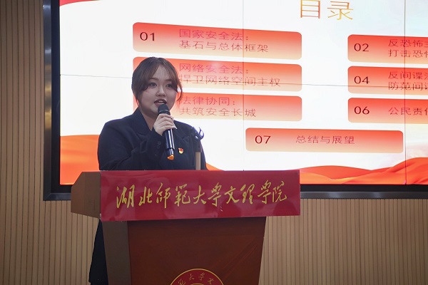 比赛中,十位参赛选手围绕国家安全主题进行了全方位、多角度的深入阐释。选手们首先从理论层面系统解读了国家安全的科学内涵,结合《国家安全法》等法律法规,详细剖析了危害国家安全行为的法律界定及相关罪名。通过分析近年来查处的典型案例,以案说法生动揭示了各类安全风险的表现形式与危害性。选手们结合大学生实际,从思想认知到日常行为,从专业学习到社会实践,多维度探讨了青年群体维护国家安全的具体路径,深入解读了总体国家安全观实践要求,引导同学们准确把握新时代国家安全工作的新特点。