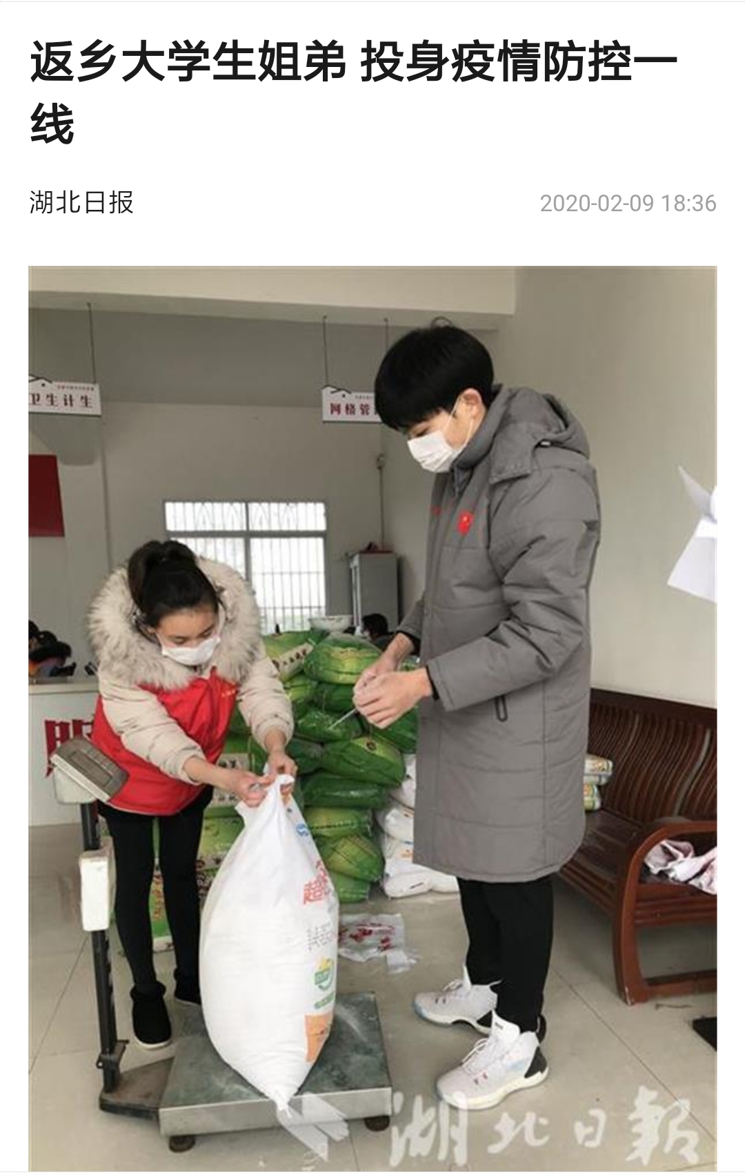 202029日,湖北日报上有一篇关于疫情防控的新闻引起广泛关注,主人翁正是玩球网页版理工学部数学与应用数学专业1603班的吕奎同学和弟弟吕东阳。据报道,202027,姐弟俩从村微信群里看到“志愿者征集令”后,28日一大早便到三州村委会报到,参与对村民生活必需品的分装发放。图片中是28当天他们在枝江市百里洲镇三洲村防疫物资分配现场填写订购物资的订购居民的姓名并给居民分配物资时的情景姐弟俩一个牵着口袋,一个则对袋中面粉进行分装。分装完面粉后,又开始为居家隔离的村民分装集中采购的大米、面条和新鲜的蔬菜并贴上标签,以备村组干部精准送达村民家中。