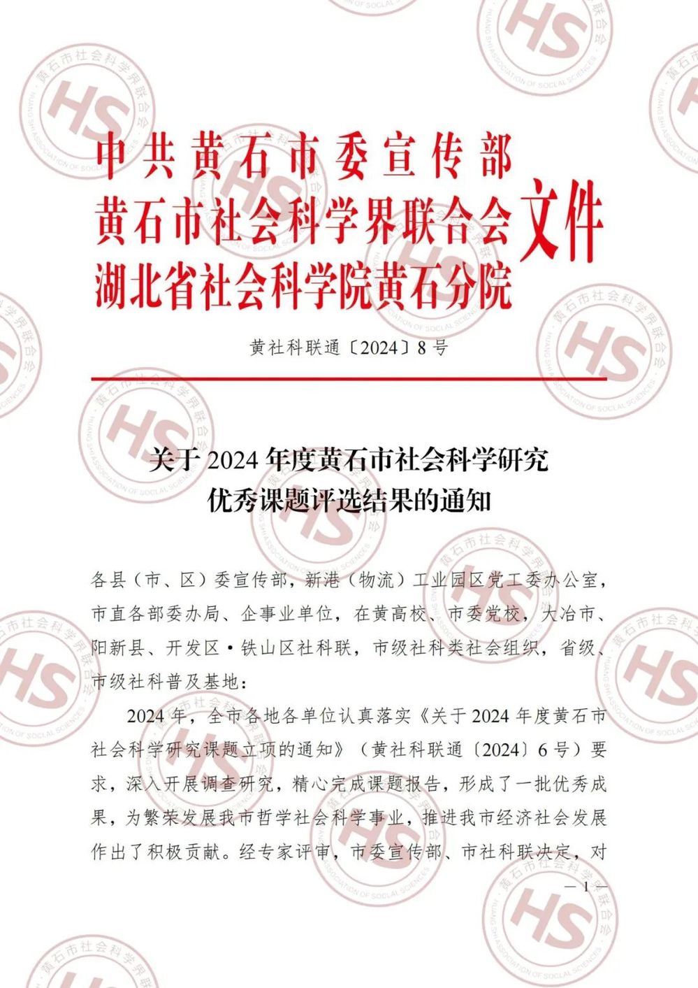 喜讯:胡蕾老师荣获“2024年度黄石市社会科学研究优秀课题”