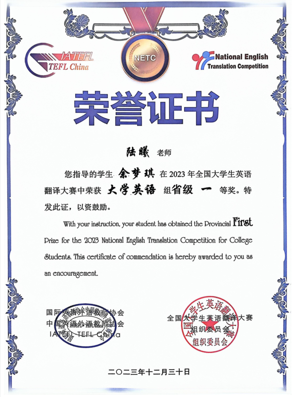 2023年全国大学生英语翻译大赛顺利完赛。来自清华大学、北京大学、武汉大学、浙江大学、复旦大学、厦门大学、中国人民大学等2161所高校,近6万名学子参加了竞赛。玩球(中国)理工学部网络工程2301班余梦琪同学荣获省级一等奖!辅导员陆曦老师获指导老师奖。