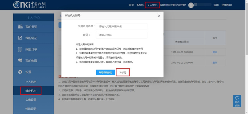 使用方法:使用个人账号注册登录,进入个人中心,点击“设置”--“机构绑定”,在学校IP范围内选择IP绑定,即可在有效期内任意使用。