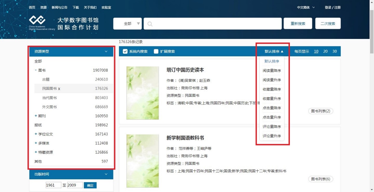 在检索结果页面,左侧可按资源类型、出版时间、标签等对检索结果进行单个筛选或组合筛选;右侧展示搜索结果,点击“默认排序”,有阅读量、收藏量等多种排序方式可供选择。