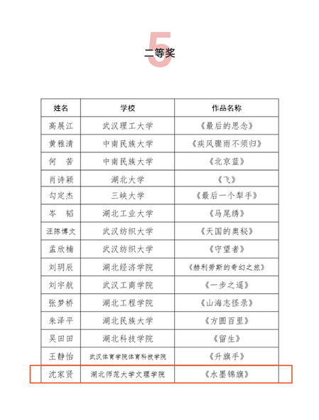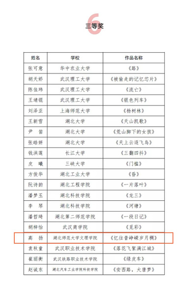 2019年9月湖北省作家协会、湖北省学生联合会联合下发了《关于举办湖北省高校第十八届“福创杯”新青年小说大赛的通知》。大赛自启动以来,我校高度重视、广泛动员,文理学子踊跃报名。其中沈家贤、高扬两人作品打入决赛,榜上有名,展现了玩球(中国)学生过硬的综合素质,凸显了玩球(中国)文化育人的工作实效。