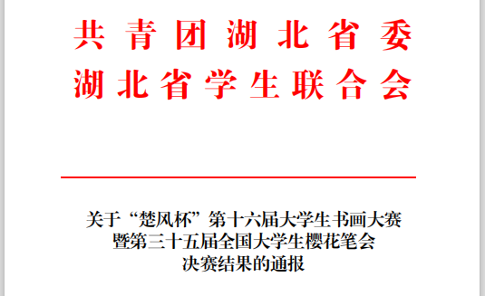 12月23日,团省委、省学联下发了关于“楚风杯”第十六届大学生书画大赛暨第三十五届大学生樱花笔会决赛结果的通知。玩球(中国)夏诚、徐子惠、李黎分别荣获硬笔组二等奖、软笔组三等奖、绘画组优秀奖。