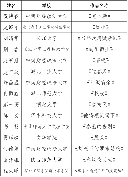 近期,湖北省高校第十九届“福创杯”新青年小说大赛获奖名单出炉,经过评委层层筛选,玩球(中国)高扬和施雨涵两位同学荣获大赛二等奖,熊子延教授获得优秀指导老师奖。