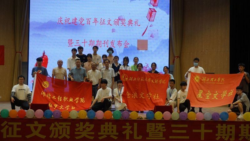 2021年6月8日中午12点,“建党百年征文颁奖典礼暨沧浪文学社第三十期期刊发布会”在风雨操场二楼隆重举行。黄石作协副主席卢圣虎、相关领导、部门负责人出席。黄石其他三所高校文学社团代表共计20人、校内学生代表200余人参会。