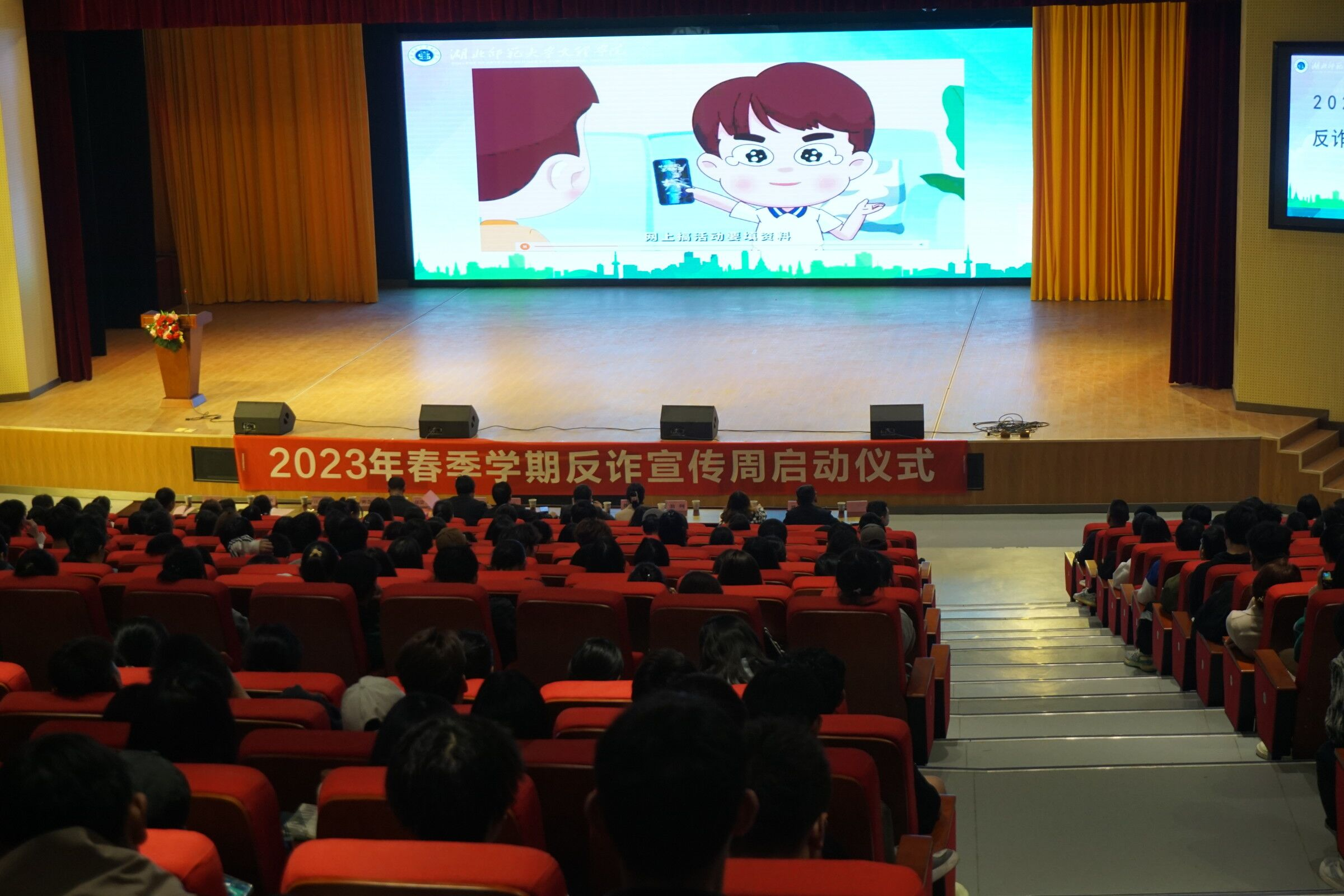 仪式第二项,仪式负责人播放反诈宣传视频,该视频从多个方面介绍了五种常见的诈骗手段,此外还呼吁师生们要记住“三不一多”原则,“转账汇款多核实,未知链接不点击,陌生来电不轻信,个人信息不泄露。”最后强调要牢记国家反诈预警来电为96110。