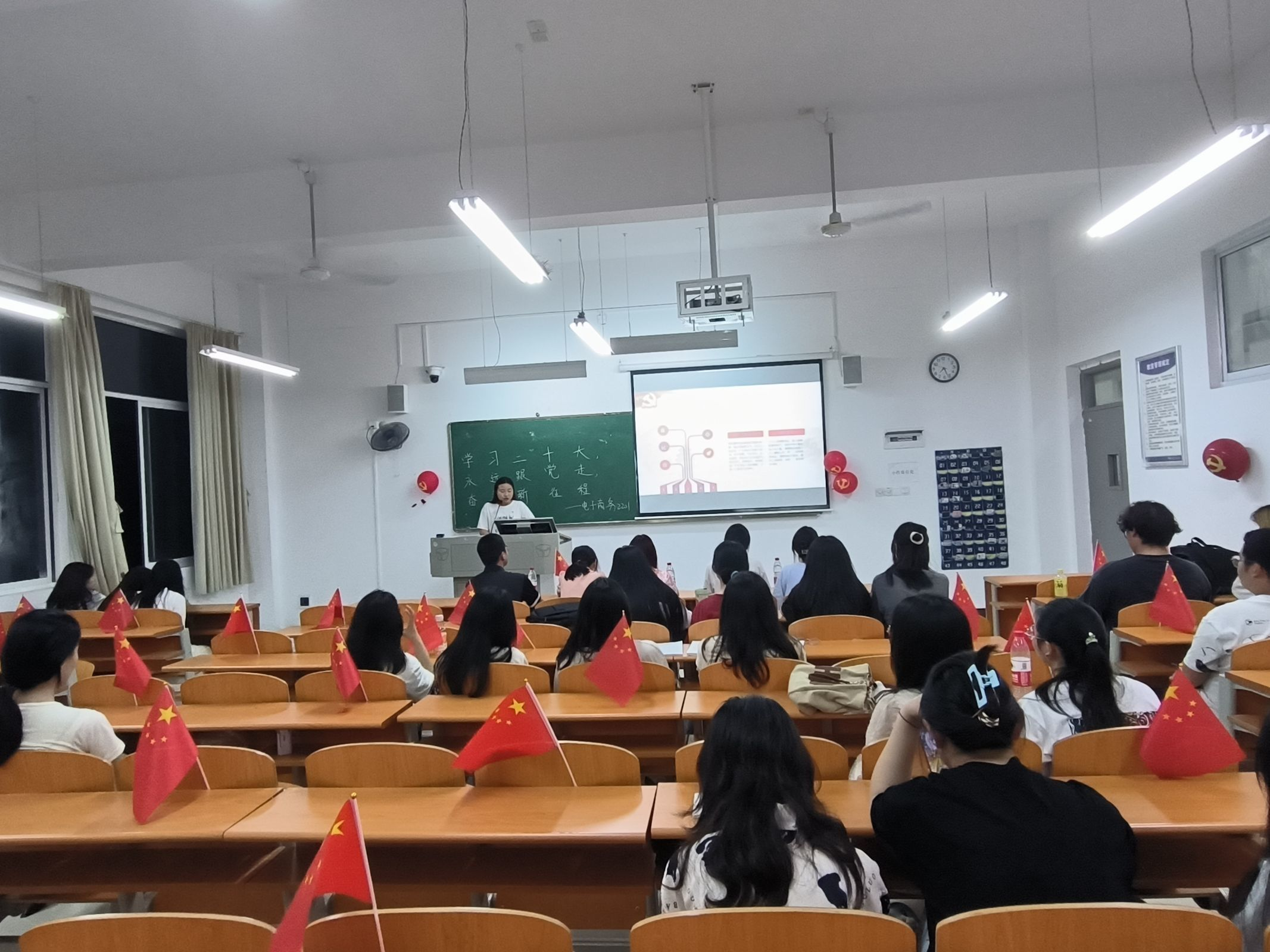 各班主持人以播放相关视频、朗诵诗歌等形式,带领同学们进一步学习二十大和了解二十大,引导同学们坚定理想信念,将理论与现实相结合,把二十大精神贯彻到日常生活的每一个方面,为伟大复兴的中国梦注入青春的力量。