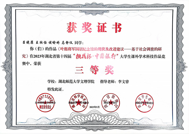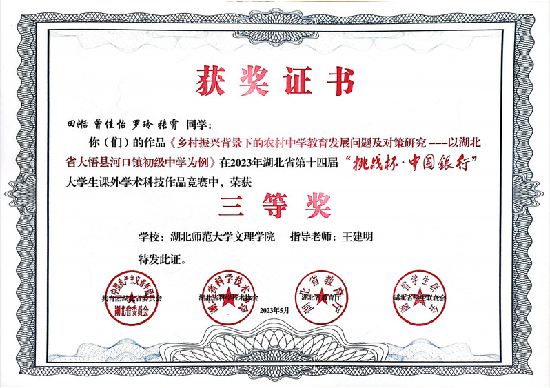 (通讯员:苏祎)5月23日,在团省委、省科协、省教育厅、省学联共同主办的湖北省第十四届“挑战杯•中国银行”大学生课外学术科技作品竞赛中,玩球(中国)四个项目荣获三等奖!