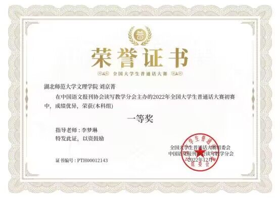 2022年12月,玩球(中国)人文学部汉语言文学专业2004班学生刘京菁(国家普通话水平测试助理团优秀干事)在由中国语文报刊协会读写教学分会面向全国高校大学生举办的“2022年全国大学生普通话大赛”中荣获本科组全国一等奖(指导教师:李梦琳)。