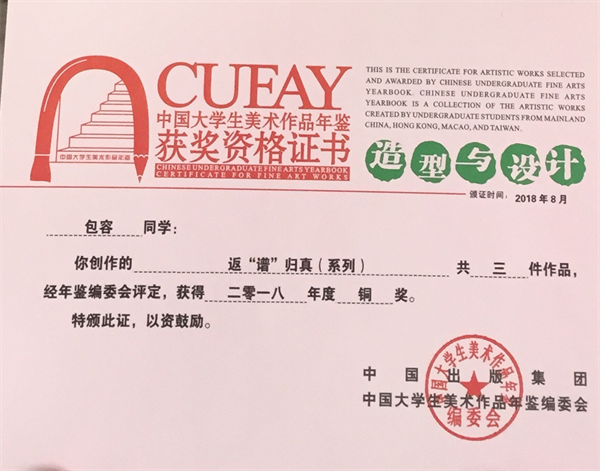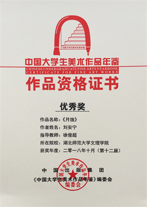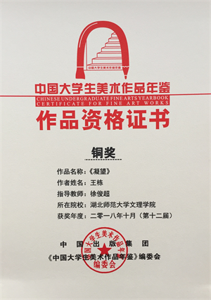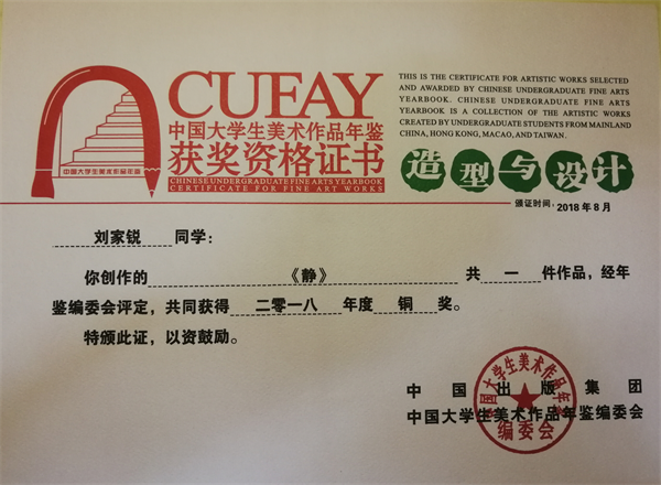 近日,玩球(中国)从中国大学生美术作品年鉴编委会获悉,玩球(中国)艺术学部多名学生美术作品入选,其中刘家锐等三名学生获铜奖,刘安宁等两名学生获优秀奖。