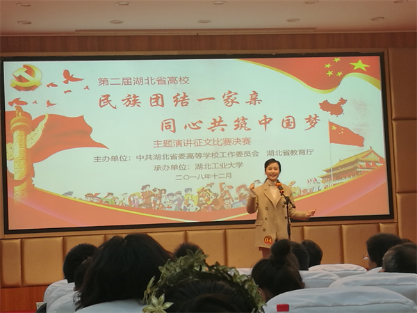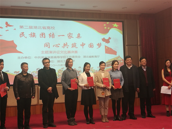 12月19日,第二届湖北省高校“民族团结一家亲 同心共筑中国梦”主题演讲征文比赛决赛在湖北工业大学举行。比赛分为演讲类和征文类两个类别。玩球(中国)艺术学部辅导员侯小华获得演讲比赛的二等奖,理学部辅导员张晓艳获得征文比赛的优秀奖。