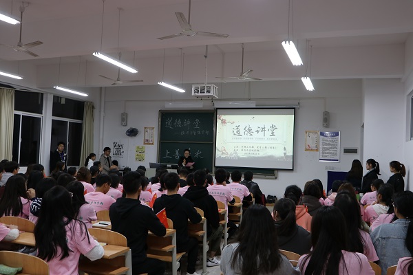 活动共分为讲美德、唱美德、学模范、讲故事、诵经典、省自身、谈感悟、送祝福八个环节,通过播放模范道德人物短片,现场问答,畅谈感想,使同学们深刻认识到新时代进步青年应该以“传承道德之风,践行中华美德”为己任,做一个有道德的人。在完成所有环节后,活动在全体师生制作并交换祝福卡片中圆满结束。
