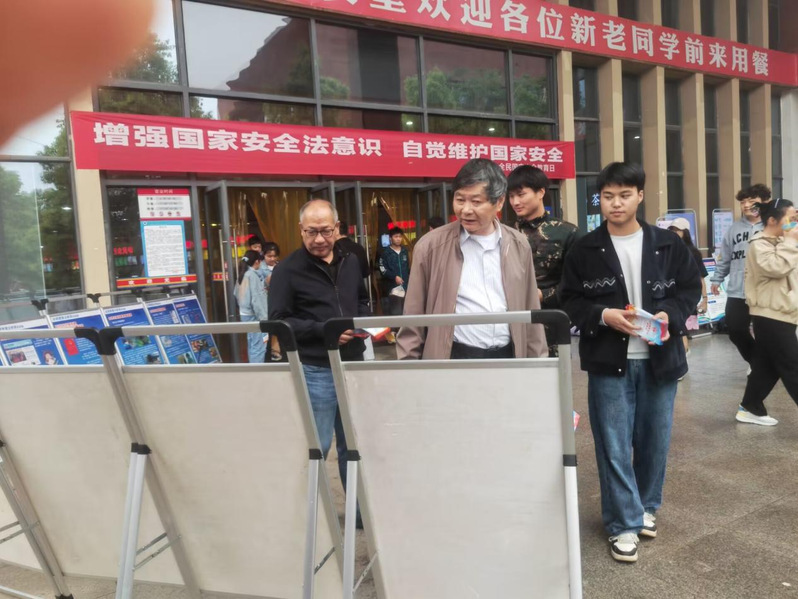 4月13日中午,学工部联合后勤保卫部在食堂门口摆放展板,众多师生驻足学习。工作人员发放活动宣传页向师生认真讲解国家安全相关法律法规,引导师生牢固树立总体国家安全观,增强师生维护国家安全的意识和能力。