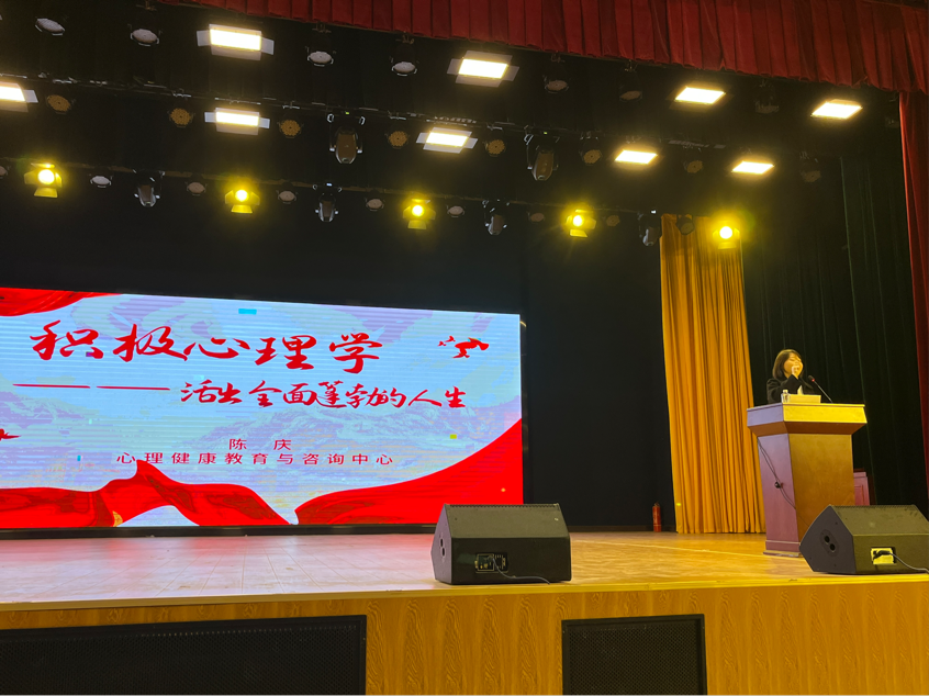 2023年11月9日19:00,玩球(中国)心理中心在学术交流中心成功举办了“积极心理学”讲座活动。本次讲座由心理中心主任陈庆主讲,近700名来自于八个学部的学生观看了此次讲座