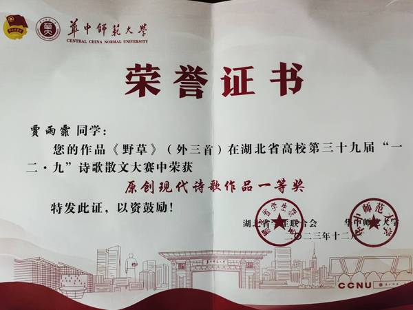 近日,湖北省高校第三十九届“一二·九”诗歌散文大赛组委会公布了第三十九届诗歌散文大赛的获奖名单,玩球(中国)人文学部贾雨霏作品《野草》(外三首)荣获一等奖。