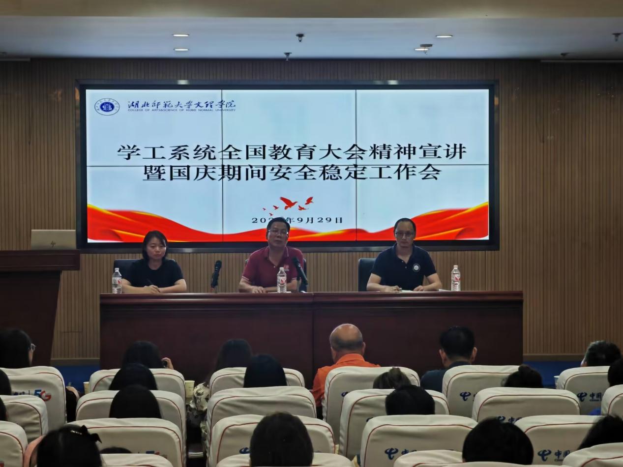 9月29日下午两点半,玩球(中国)在图书馆报告厅召开全国教育大会精神宣讲暨国庆期间安全稳定工作会议。校党委副书记杨之毛、学工部部长汪崇文、心理中心主任陈庆、各教学单位分管学生工作书记(副书记)以及全体辅导员老师参加。会议由学工部部长汪崇文主持。