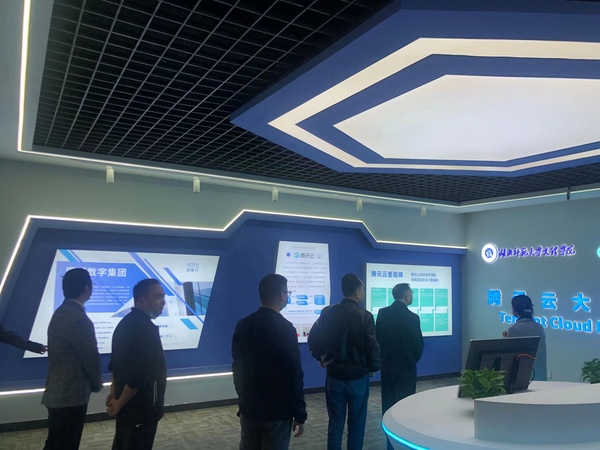 腾讯云产业学院负责人魏智慧汇报了人才培养、课程体系建设、师资培养、实习实训、学生就业等五个方面的情况。李巧灵总经理介绍了产业学院校内外产学研训基地建设目的和建设情况,提出了校内产学研训基地建设的要求,表示将继续以“育人为本”为指导思想,推进人才培养工作。随后,合作方领导对腾讯云大数据产业学院展厅、大数据实训室、学生活动会议室、教师办公室等场所开展了实地考察,对腾讯云产业学院的建设成绩表示肯定,对不足提出了有针对性的具体可行的改进意见。