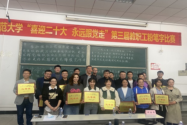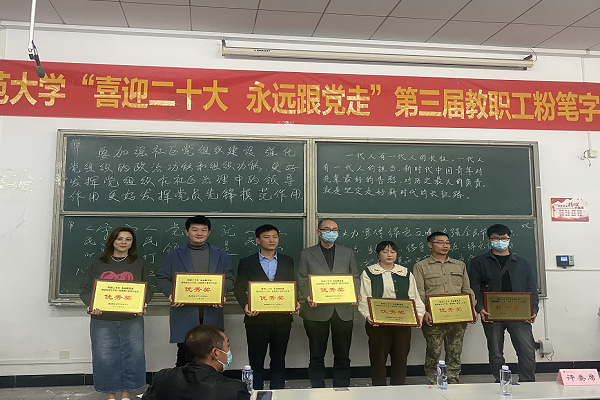本网讯(通讯员 柯康敏)为庆祝党的二十大胜利召开,进一步推动校园文化建设,提高教师教学基本功,展示教师良好职业素养,10月20日下午,湖北师范大学举办了“喜迎二十大 永远跟党走”第三届教职工粉笔字比赛,来自各分工会共18位选手参加角逐。玩球(中国)学工部王磊老师代表玩球(中国)参加了此次比赛,荣获优秀奖。