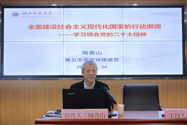 会议邀请到黄石市学习贯彻党的二十大精神市委宣讲团成员周青山教授来校专题宣讲二十大精神。周青山教授以《全面建设社会主义现代化国家的行动纲领》为题,以二十大主题为纲,从深刻领会过去5年工作和新时代10年伟大变革、深刻领会开辟马克思主义中国化时代化新境界、深刻领会中国式现代化的中国特色和本质要求、深刻领会全面建设现代化国家的重大战略部署、深刻领会坚持党的全面领导以及全面从严治党等五个方面,分别阐释了全面建设现代化国家的基础条件、指导思想、路径方式、战略部署和领导力量。报告重点突出、脉络清晰、生动形象、切合实际,对我们更准确的理解和全面把握党的二十大精神具有重要的指导意义。