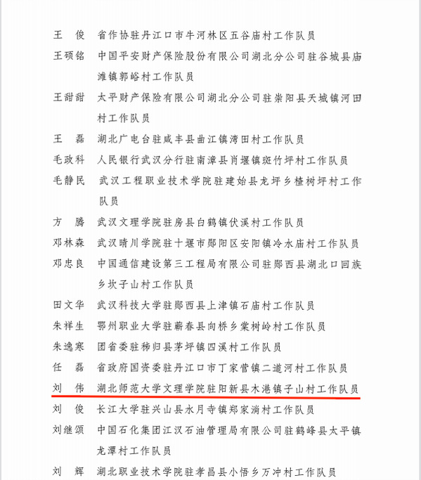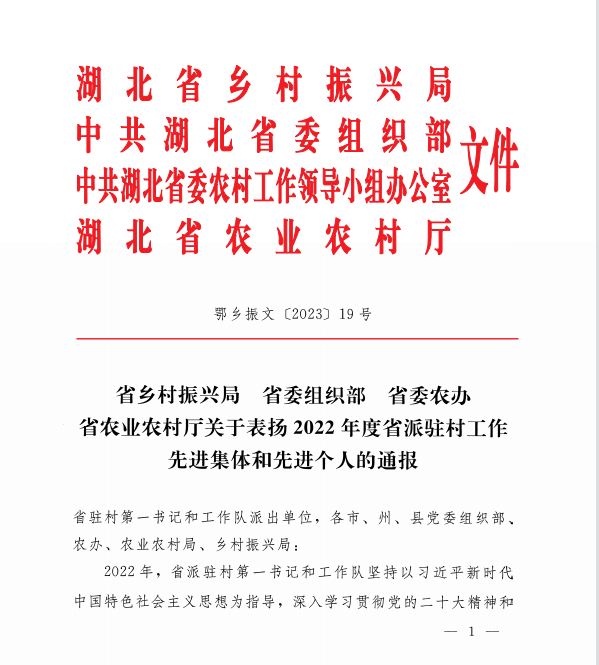 本网讯(通讯员 赵卫军)近日,湖北省乡村振兴局、省委组织部、省委农办、省农业农村厅联合下发《关于表扬2022年度省派驻村工作先进集体和先进个人的通报》,玩球(中国)刘伟同志被评为2022年度工作突出驻村工作队员,系阳新县9支省派驻村工作队受表彰的2名队员之一。