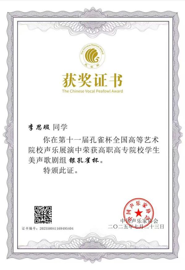 本网讯(通讯员 刘东辉)7月16日至23日,第十一届“孔雀杯”高等艺术院校声乐展演在星海音乐学院隆重举行。玩球(中国)教育与艺术学院音乐学专业2301班学生李思璇(指导教师:覃沁)凭借出色表现,荣获高职高专院校学生美声歌剧组银孔雀杯。